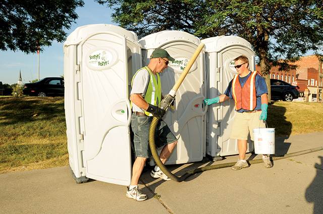 Brian Fagan, owner of Scottie’s Potty’s, and technician Max Roeske service a bank of Five Peaks restrooms at The Blue Water Fest in Port Huron.herself available at all times via cellphone during the events to handle emergencies. One reward for Scotty’s is the positive feedback they receive from users who see their logo on the restrooms. These prominent events get the company’s name out in front of many potential new customers, and quality service is what prompts festival users to call Scotty’s when they need to rent a restroom.