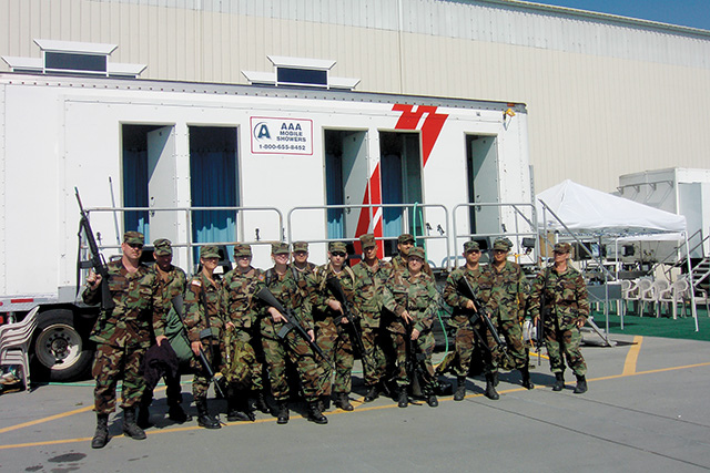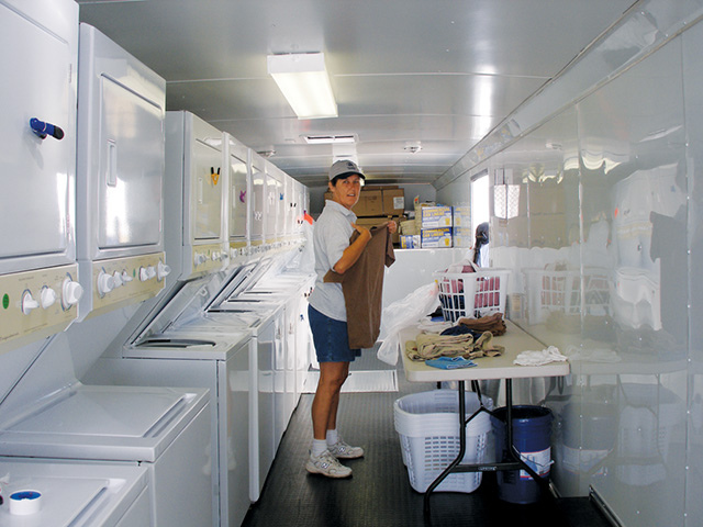 Today, the company’s fleet of equipment includes three 1995 Volvo semi tractors; seven 28- to 36-foot-long home-fabricated mobile shower trailers built on units manufactured by Tuff Boy Leasing & Equipment Sales, Haulmark Industries and Fruehauf; five home-fabricated laundry trailers, built using 18- to 48-foot-long cargo trailers made from Haulmark, Pace American and Carson Trailer; several electric generators made by Caterpillar and SDMO; six tractor-trailer water tankers with 4,000-gallon stainless-steel tanks, some built by Beall Corp.; and two 1995 Volvos with 3,600-gallon tanks, built out by T & B Sales. The tanker trucks and trailers use S Series centrifugal, self-priming pumps made by Pacer Pumps, a division of ASM Industries.