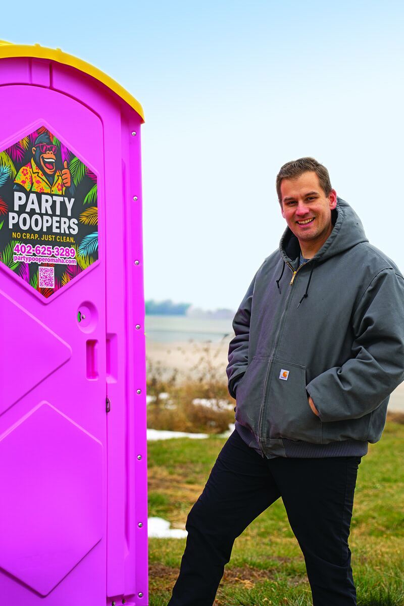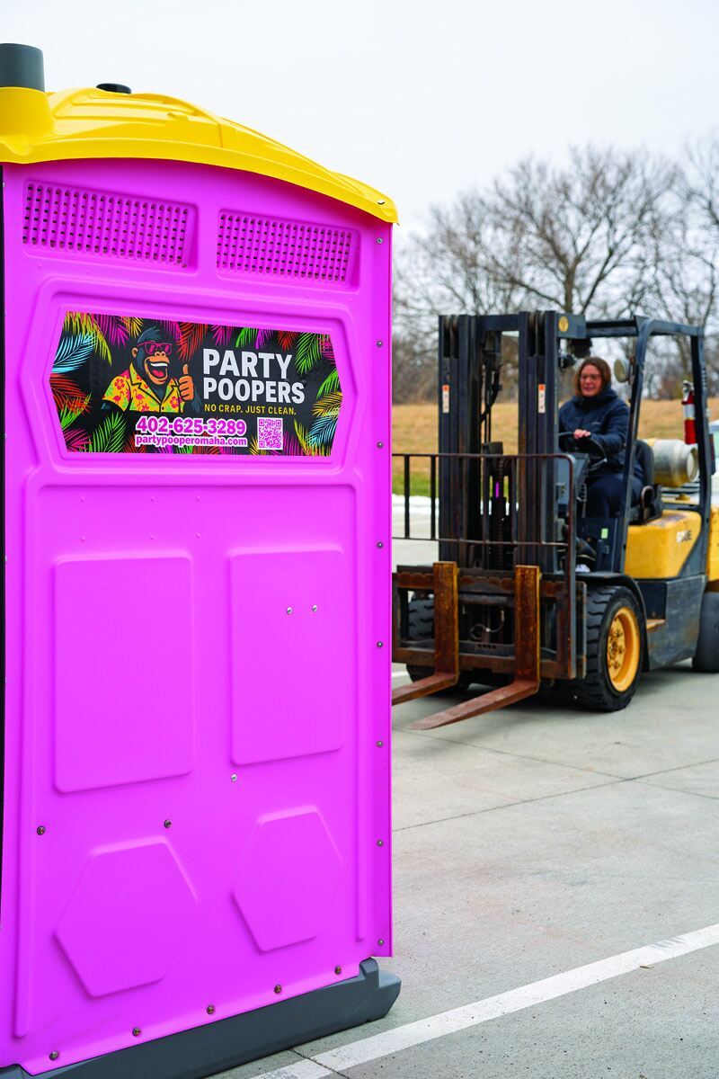 “We went with Party Poopers because we’re focused solely on events and we thought it was a fun name,” Anderson says. “A giant gorilla in a Hawaiian shirt is our mascot, and he’s got a Miami Vice vibe. We’re in Nebraska, and there are no palm trees here, but a lot of customers have told us we’re making bathrooms fun.”