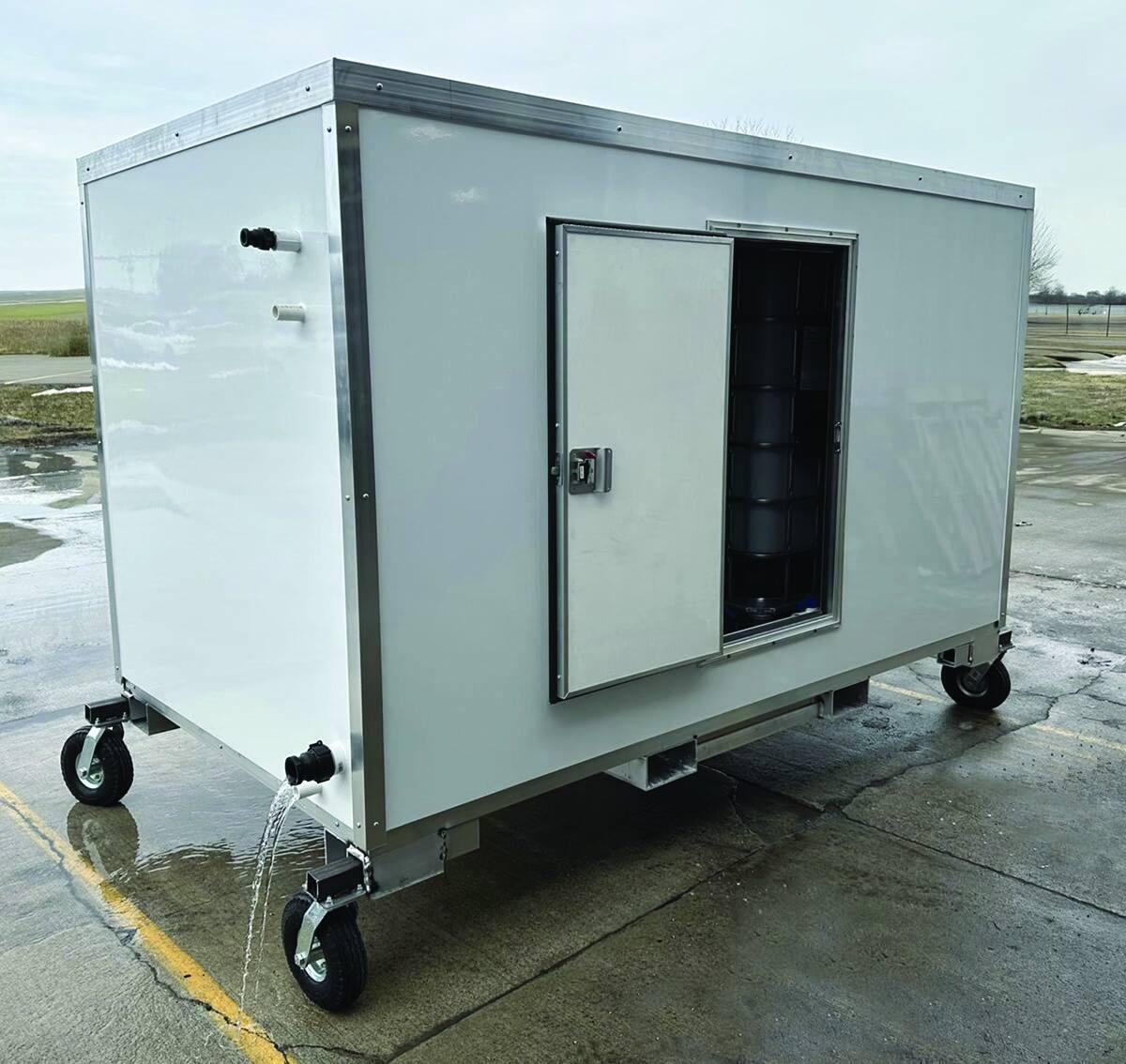 All necessary components are conveniently located within the box, including a 270-gallon water tank and 300-gallon waste tank that can support one or two modular offices, averaging 450-600 flushes, conveyed via built-in integrated sewage pump, which provides consistently steady water pressure. The interior is illuminated with LED lighting, and is powered via a single 12-volt, 16-amp outlet. An onboard healing system and insulated walls provide an all-season temperature rating of minus 30 to 155 degrees F.
