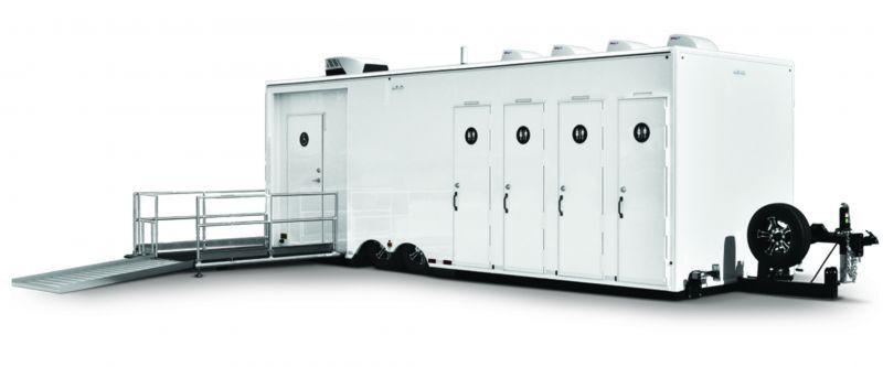 The 26-foot unit is equipped with four standard stalls and one wheelchair-accessible unit, supplied by a 200-gallon freshwater and 300-gallon waste tank, or the operator can utilize direct water/sewer connections. All five toilets use vacuum technology, which Branan says only expends 1 quart per flush.